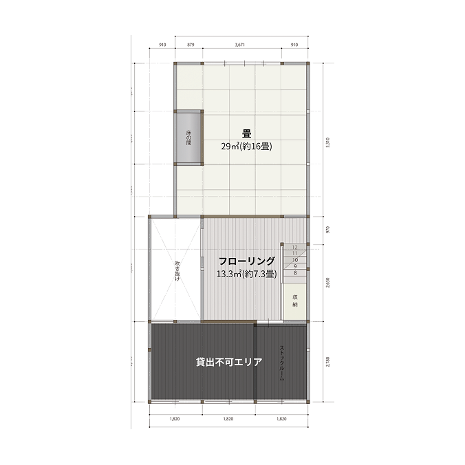 ちゃぶ台(4人掛)×1 折り畳み式ローテーブル(2人掛)×3 バタフライテーブル(4人掛)×1 丸座布団×12 床の間 姿見×1 展示棚(0.5m×5.3m)×1 サーキュレーター×1 スリッパ×10 靴箱 |